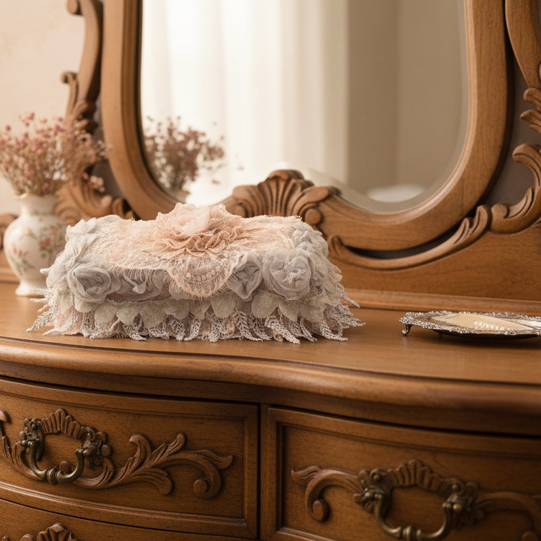 About the product-Few items are as useful and necessary in the world of home accessories as a tissue box cover. With our Floral Tissue Box Cover, an exquisite fusion of artistry and functionality, you can elevate your ordinary products. This cover turns a plain tissue box into a beautiful decorative item. It is embellished with a variety of laces and small handcrafted flowers.