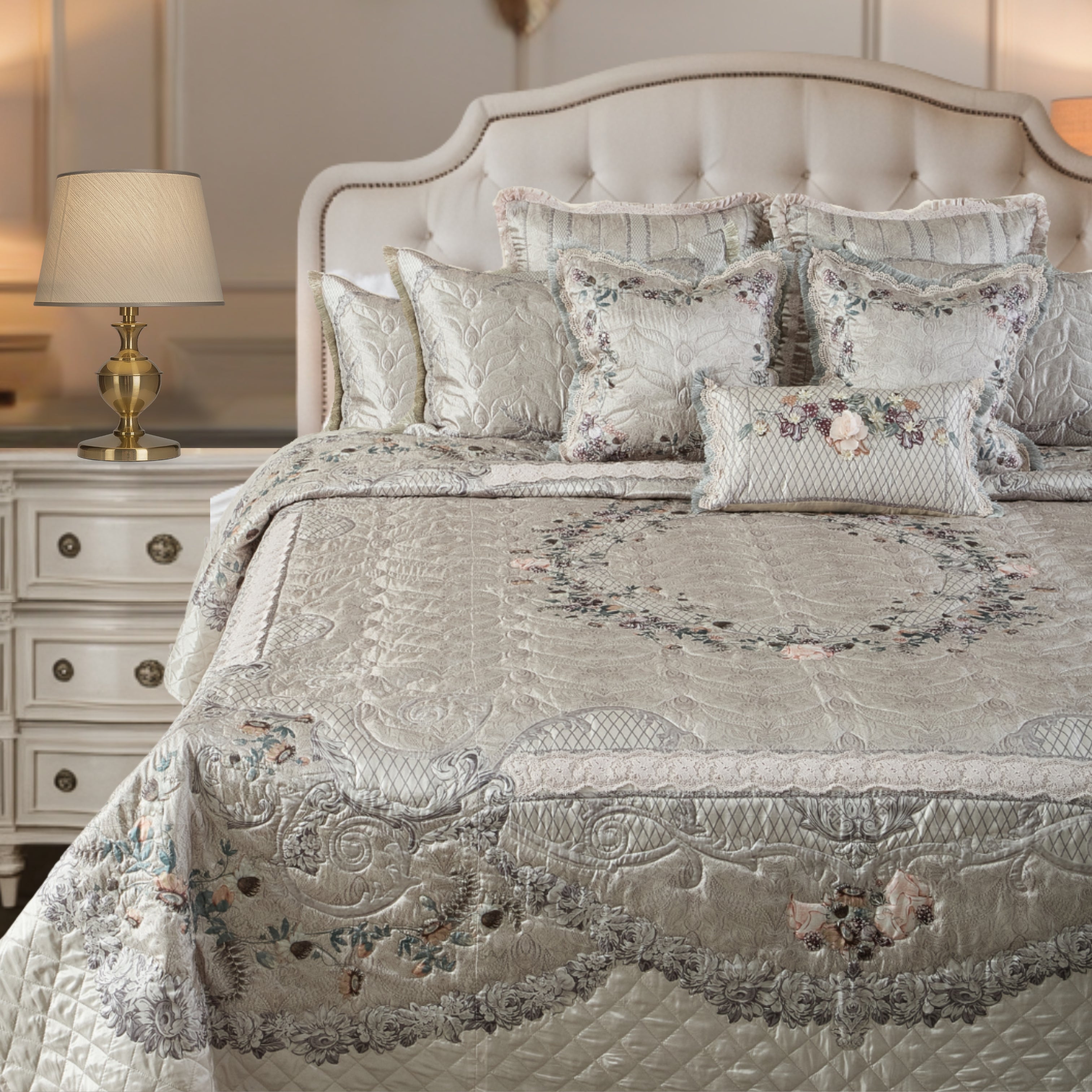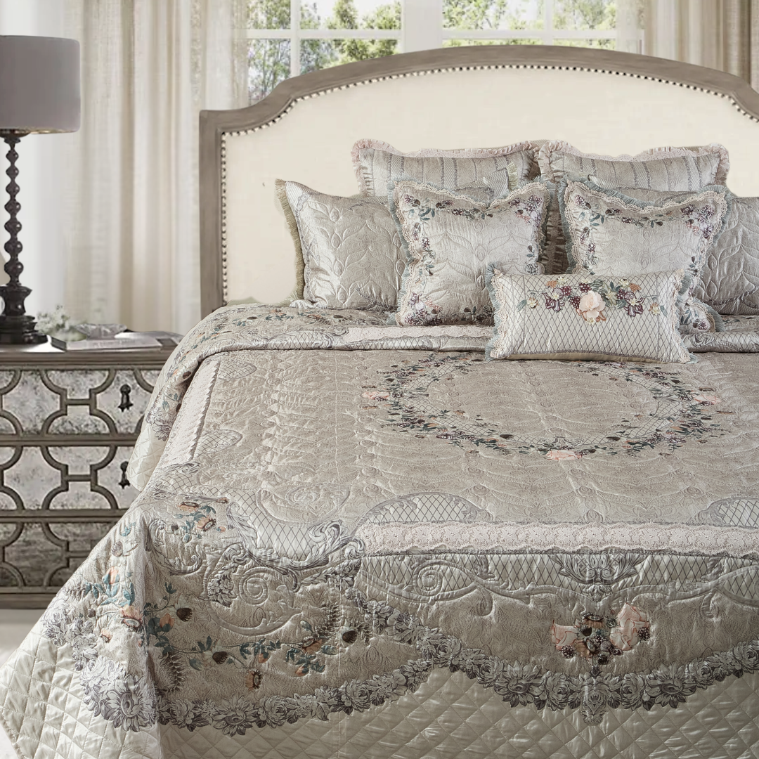 " luxurious king-size Dazzle bedcover set adorned with exquisitely intricate floral patterns. The bedspread, pillows, and cushions harmoniously blend pastel hues with detailed designs, evoking a sense of tranquility and elegance that transforms any bedroom into a haven of sophistication and comfort."