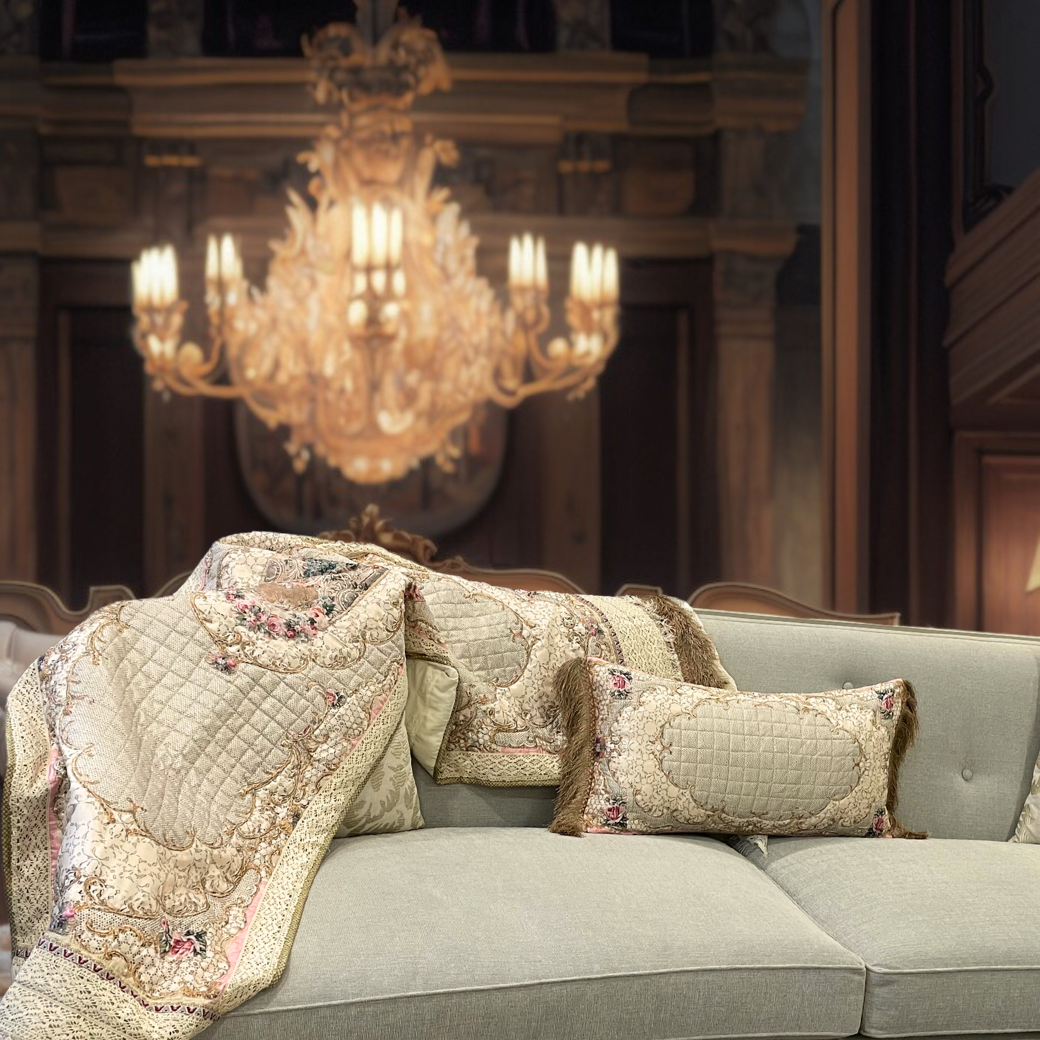 About the product -Introducing the Negrin throw intricate floral designs in shades of pink, ivory, and gold. With lace details, ruffled edges, and ornate golden borders, this set exudes elegance and sophistication. The soft, neutral color palette, along with a detailed oval motif and roses in various hues, adds a luxurious touch to any space.