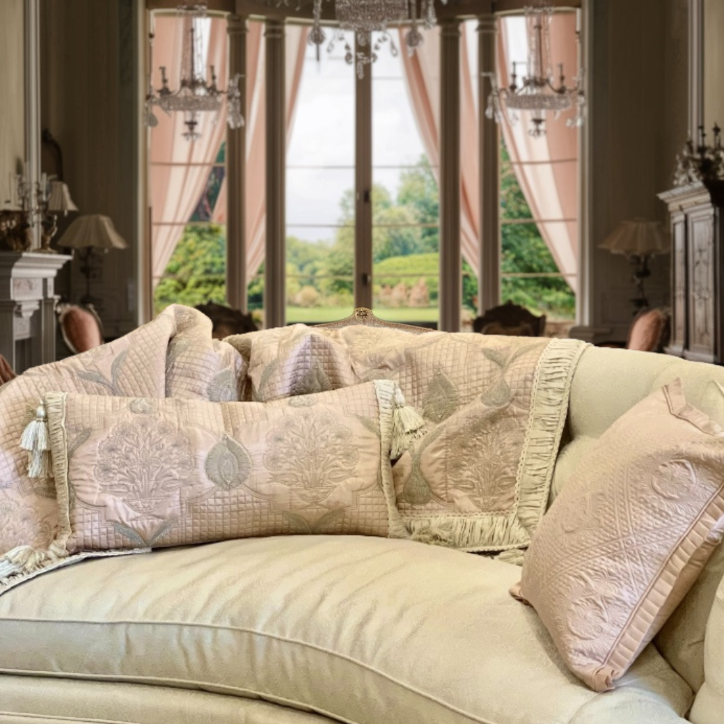 About The Product - The luxurious sofa throw quilted, adorned with intricate patterns, and features elegant tassels. A decorative pillow with similar patterns complements the ensemble, creating an ambiance of refined elegance and comfort, perfect for adding a touch of sophistication to any living space.