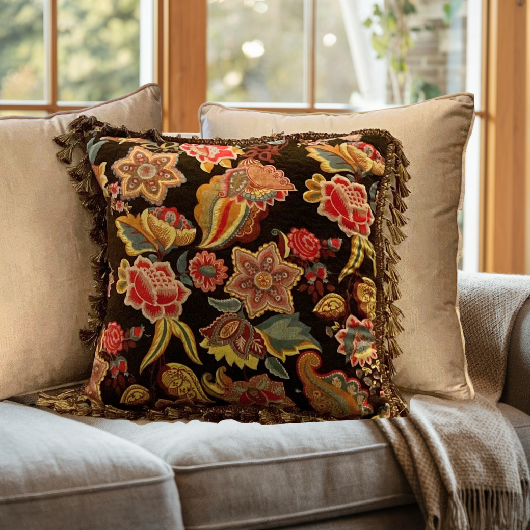 This decorative cushion features an intricate and vibrant floral embroidery design set against a rich, dark background. The colourful flowers, leaves, and paisley-inspired patterns are beautifully detailed in shades of red, gold, green, and blue, giving it an elegant and timeless look. The cushion is edged with a fringe trim, adding a touch of texture and sophistication. Perfect as an accent piece, this pillow combines traditional craftsmanship with a bold design, making it ideal for enhancing the style of sofas, chairs, or beds in living spaces or bedroom.