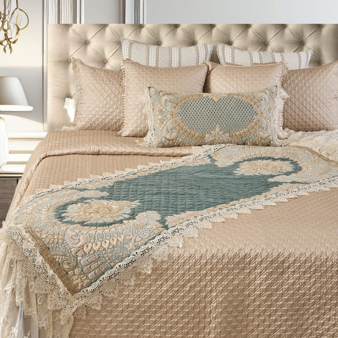 About the product - Our Victorian 5 pcs set will enhance the elegance of your bed and is the ideal fusion of style and comfort. The horizontally positioned, styled Bed runner, which is close to the footer, oozes vintage charm and is expertly created. The bedspread has quilting with patterns that gives your bed an additional layer of pleasure.