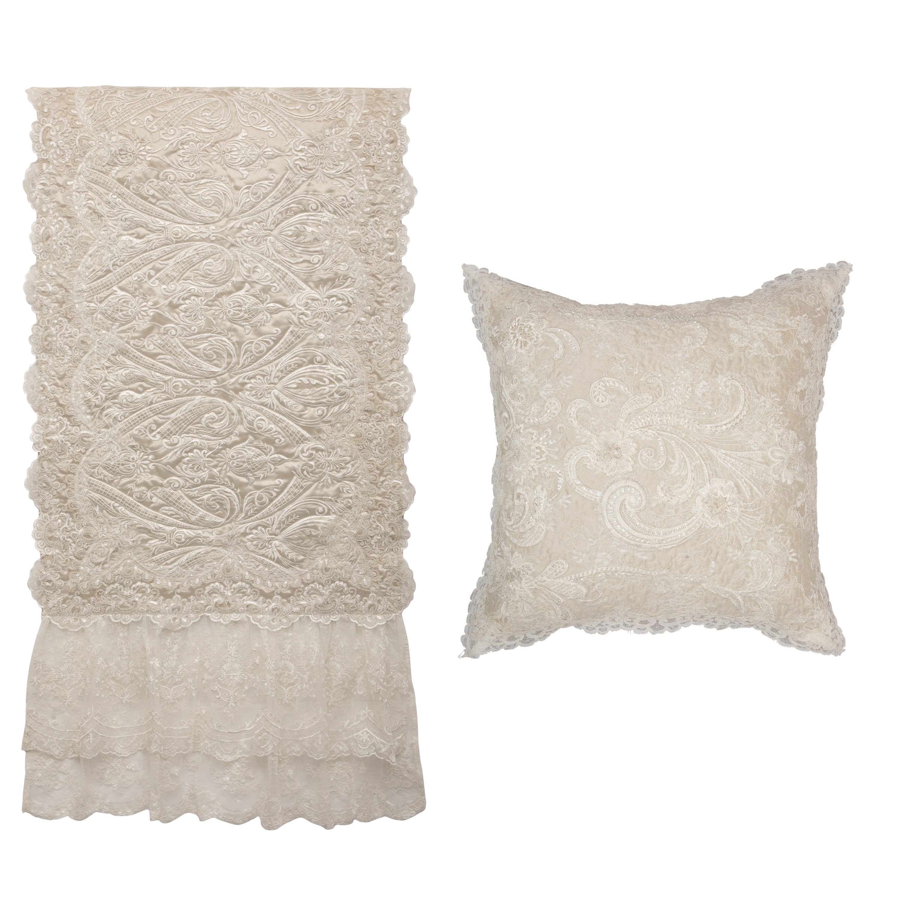 Extra info - Runner embellished with print, lace, tassels, quilted front and plain back. Filler not included. Photo colors may vary slightly from actual.