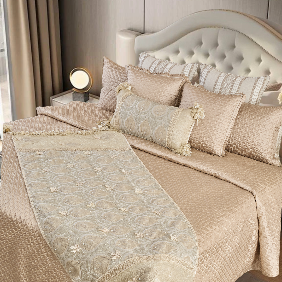 About the product - LA- Bella sofa throw is light beige or off-white with intricate patterns resembling intertwined leaves . The top has a subtly raised texture, adding depth. At the bottom, a fringe with small tassels enhances its elegant appeal, making it a charming addition to any room seeking a touch of sophistication.
