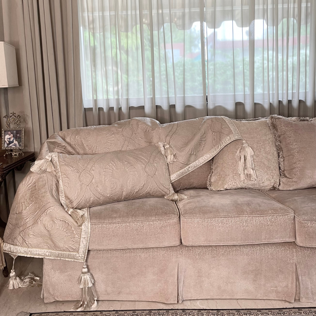 About the product -Discover luxury and comfort with our collection of exquisite jamawar sofa throws and decorative pillows. Each piece features intricate patterns and a soothing muted beige palette, crafted from premium fabrics for a rich texture. Our pillows come adorned with tassels, adding a touch of elegance to any space. Elevate your home décor with timeless style and exceptional quality. Shop now and transform your living space into a haven of sophistication and comfort.