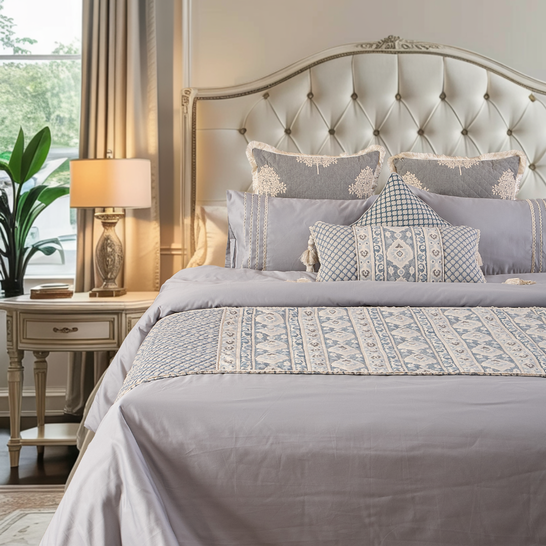 Discover our exclusive 7-piece bedding set, meticulously crafted to elevate your bedroom décor.This set includes luxurious Runner, plush pillows, a stylish quilt cover Made from premium cotton, each piece offers unparalleled comfort and durability, ensuring a serene and stylish sanctuary in your home. Perfect for those who appreciate quality and contemporary design, this set promises to enhance your sleep experience with elegance and sophistication.