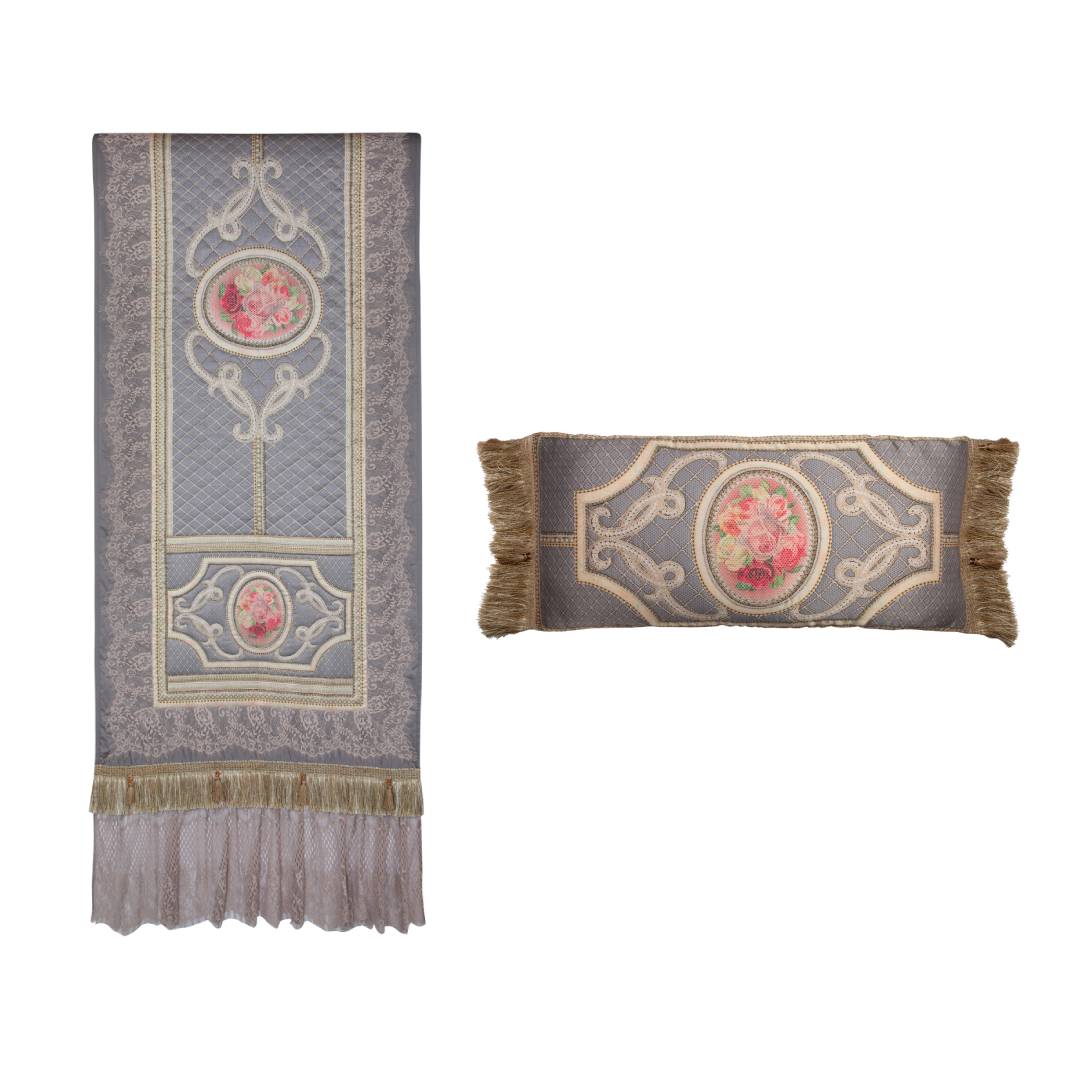Extra info - Runner embellished with print, lace, tassels, quilted front and plain back. Filler not included. Photo colors may vary slightly from actual.