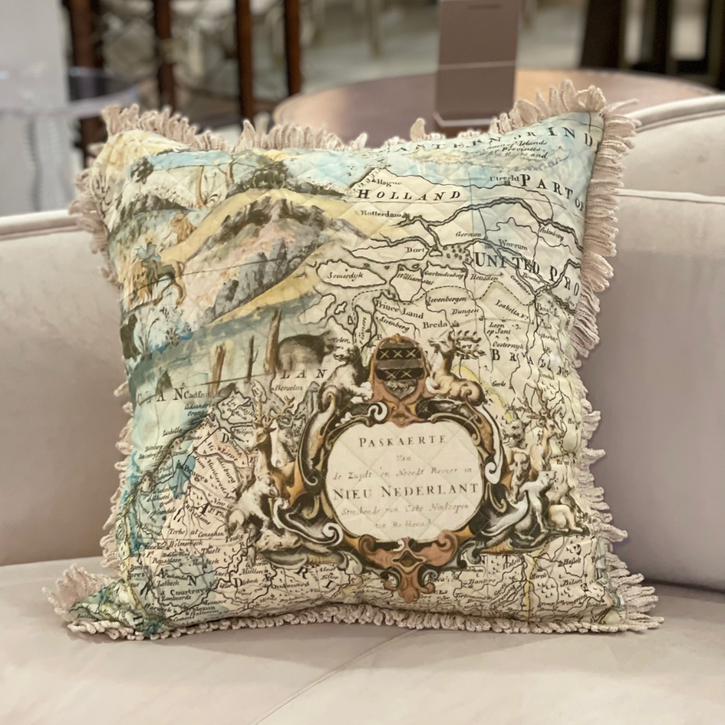 This decorative cushion features a vintage-style map design, showcasing intricate cartographic details and artistic embellishments in soft, muted tones of cream, blue, and gold. The center displays an ornate emblem with heraldic symbols, adding a touch of historical charm. The cushion is accented with a delicate fringe border, enhancing its elegant and classic appeal. Perfect for travel enthusiasts or lovers of historical decor, this cushion adds a refined, worldly aesthetic to any sofa, chair, or bed.