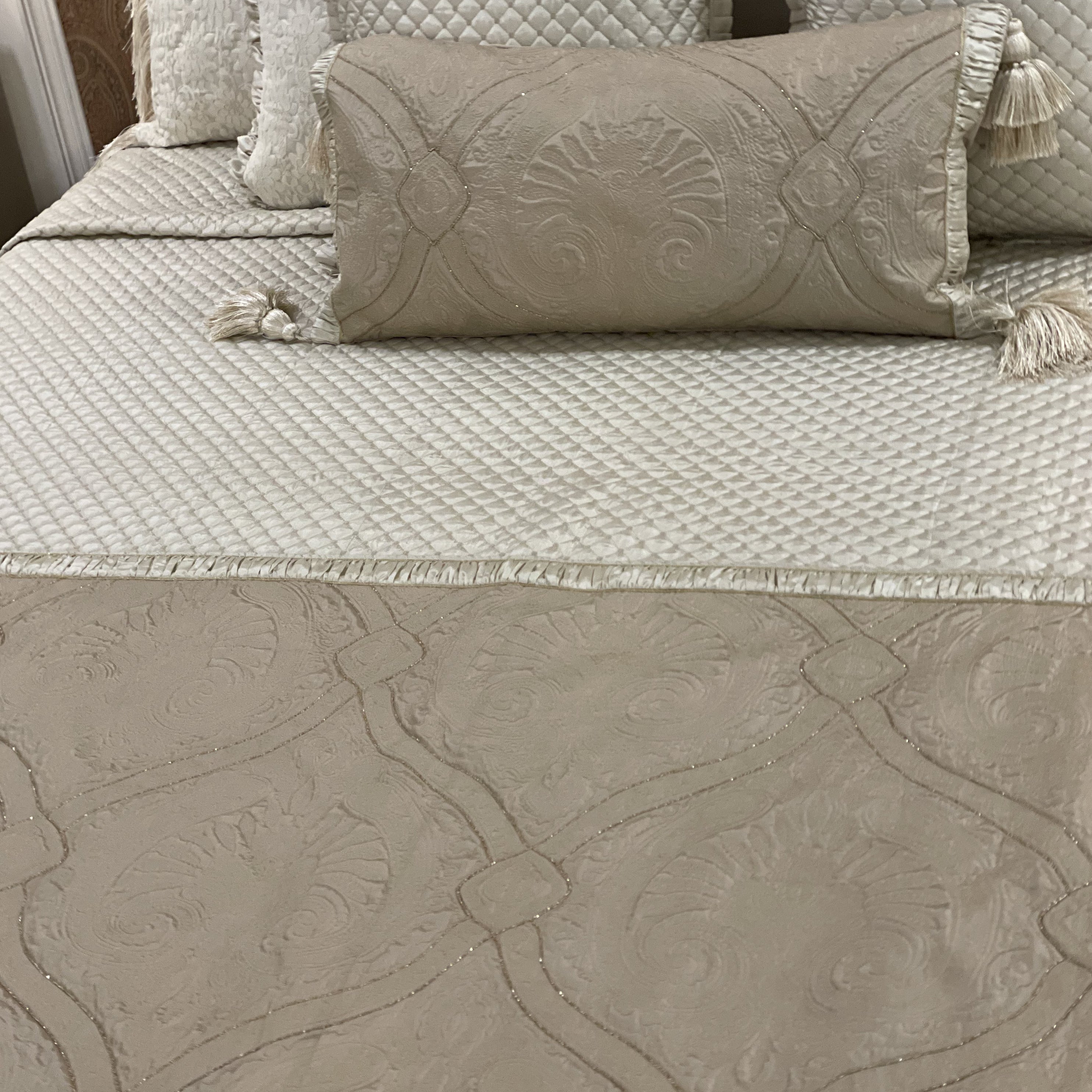 "Jamawar 5-Piece Set: A Quilted Bedcover Set complete with a runner and matching cushion. The beige quilted runner is adorned with a delicate lace pattern featuring intricate floral designs, exuding an aura of sophistication and timeless charm."
