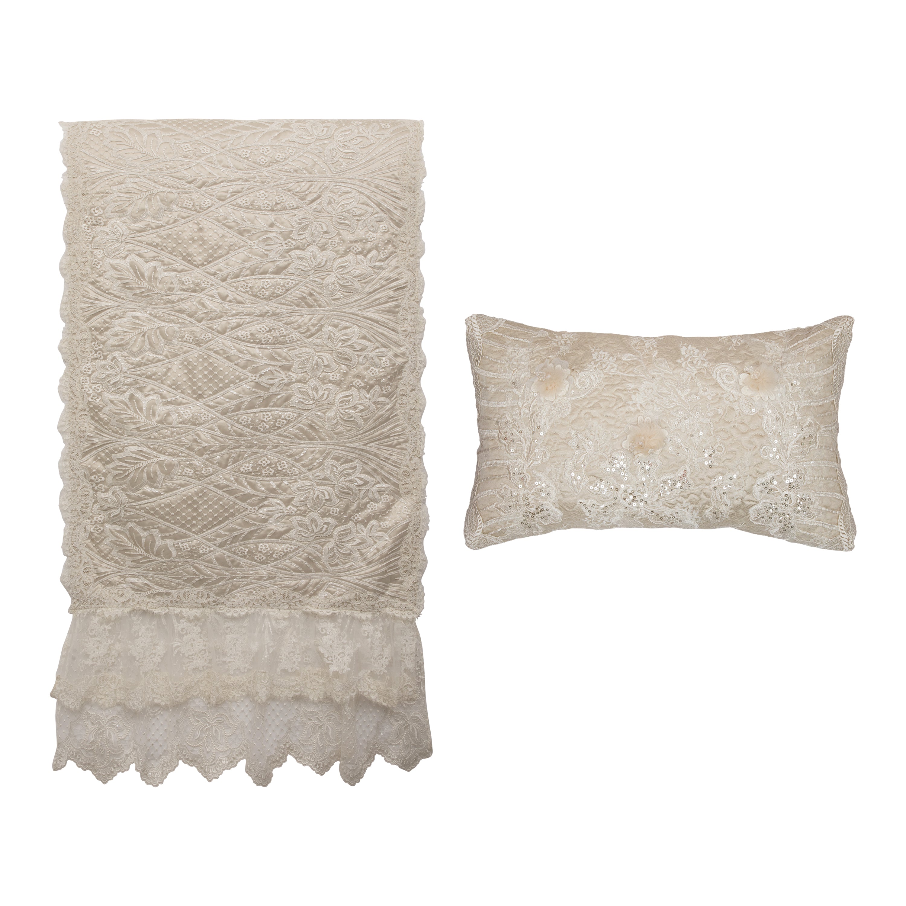 Extra info - Runner embellished with print, lace, tassels, quilted front and plain back. Filler not included. Photo colors may vary slightly from actual.