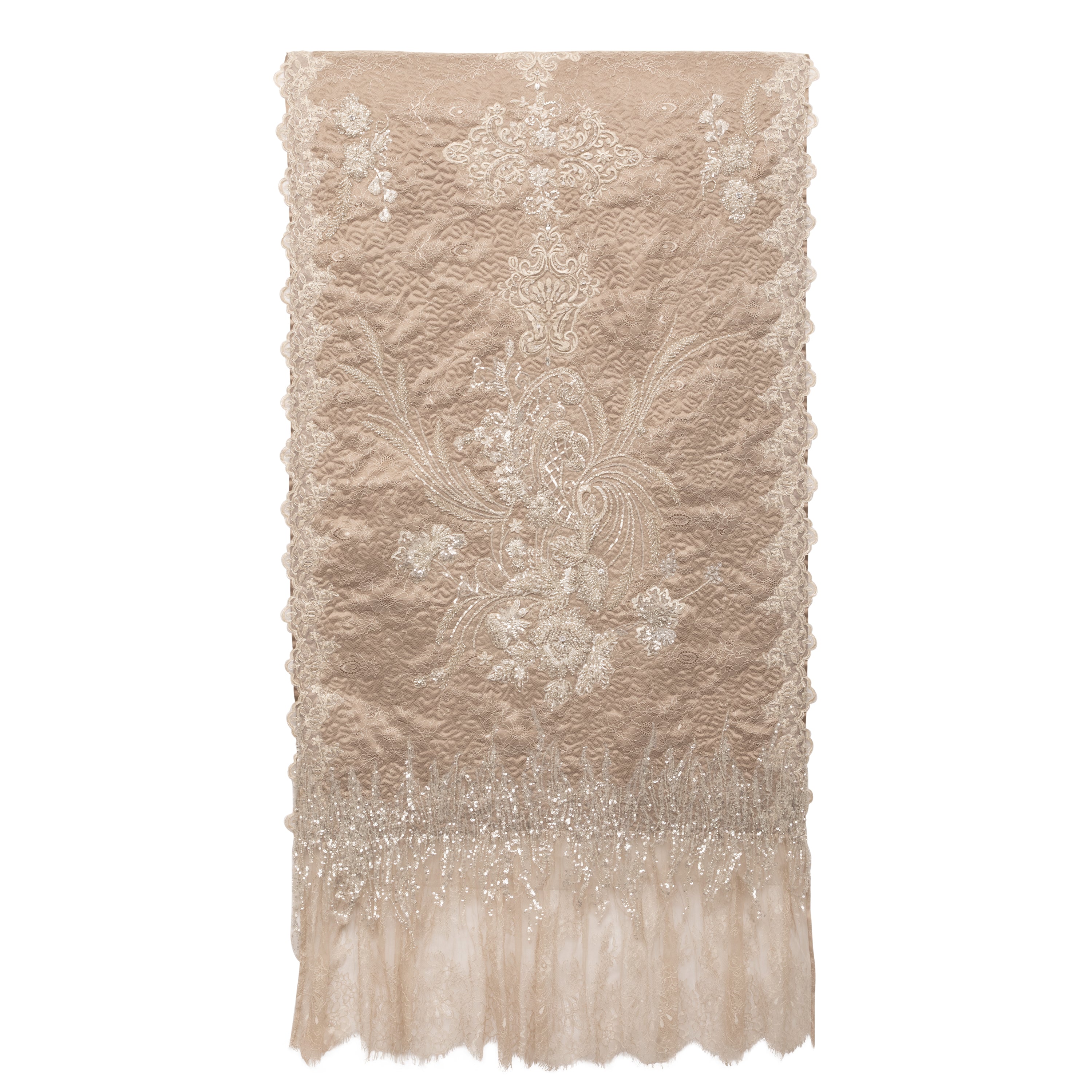 About the product - A luxurious runner crafted in a soft blush tone, adorned with intricate floral embroidery and delicate beadwork. The cascading lace border adds a dreamy, vintage charm—perfect for elevating any bedroom décor with a touch of timeless romance.